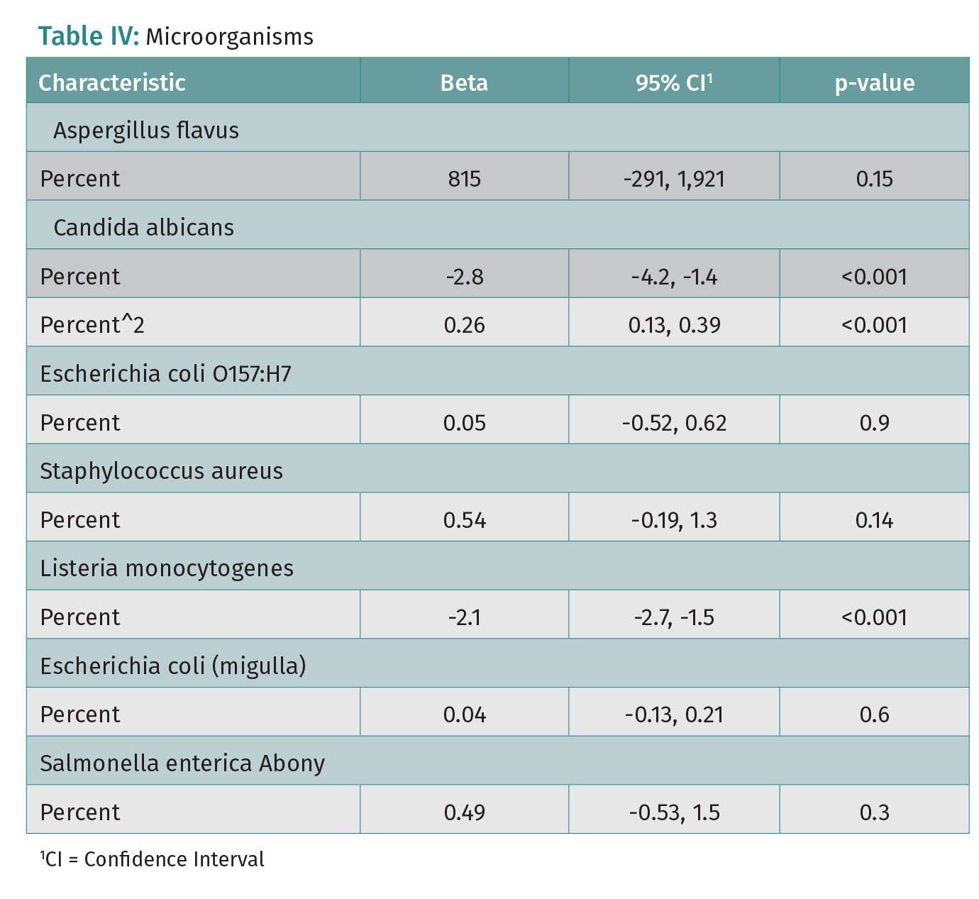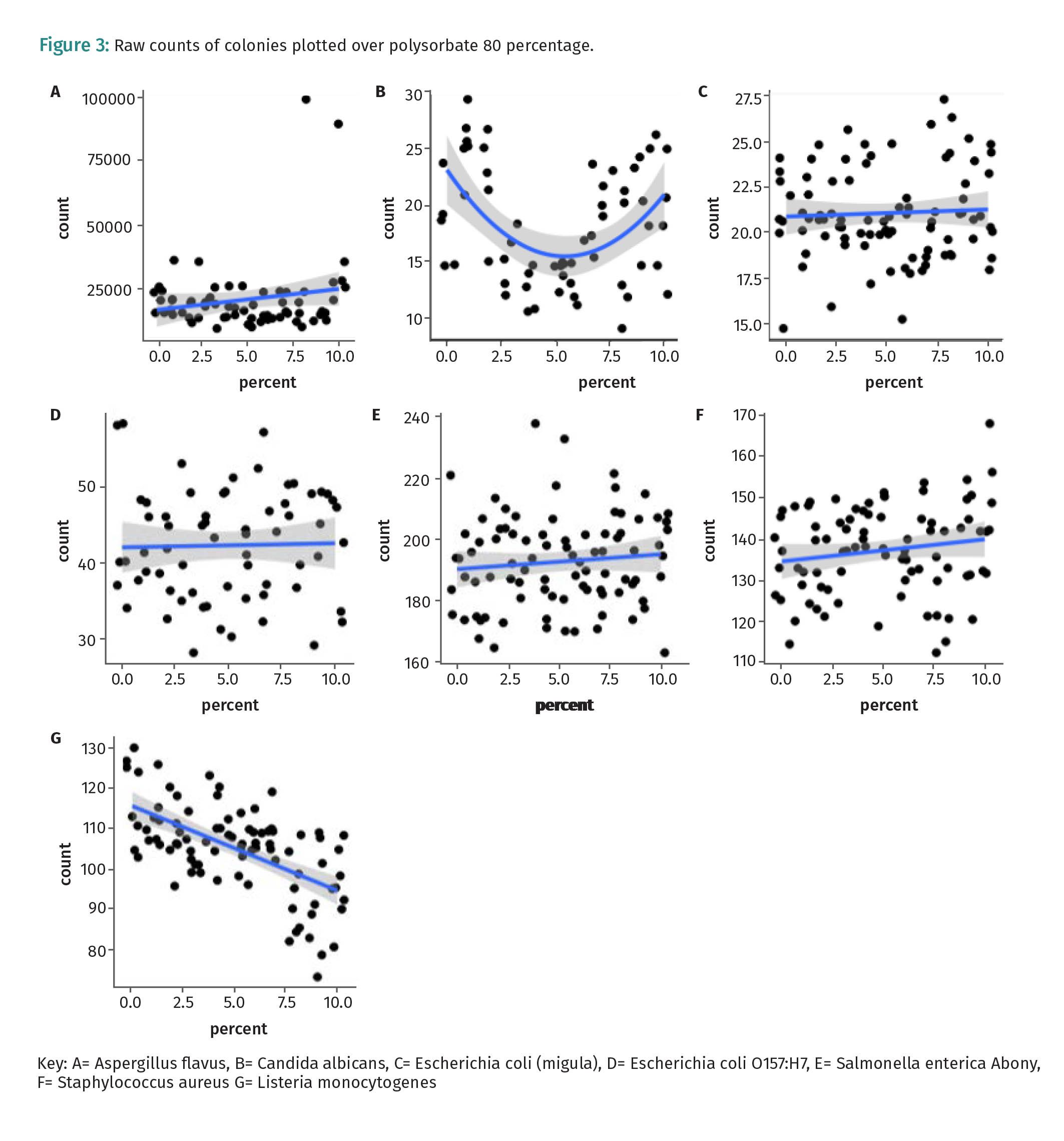 There were no significant associations between polysorbate 80 levels and A. flavus, E. coli O157:H7, S. aureus, S. enterica, and E. coli (migula). There was a significant association between polysorbate 80 and Listeria count, with every percent increase in polysorbate 80 associated with a mean decrease of -2.1 (95% CI: -2.7, -1.5) in Listeria count. Initially, the relationship between C. albicans and polysorbate was modeled with a linear fit. However, diagnostic residual plots indicated there was a non-linear relationship between C. albicans and polysorbate 80. Adding a quadratic term (the percentage of polysorbate 80 squared) led to a better fit. The new quadratic model indicates that increasing percentage of polysorbate 80 is associated with a mean decrease of -2.8 (95% CI: -4.2, -1.4) C. albicans count, but only up to a certain point. Around 6% polysorbate 80, higher percentages are associated with an increase in C. albicans count. However, these results are impacted by larger levels of missingness in C. albicans count for polysorbate 80 percentages between 3-6%, and future research is needed to validate these findings. A linear regression without the quadratic term found no significant relationship between polysorbate 80 and C. albicans count.