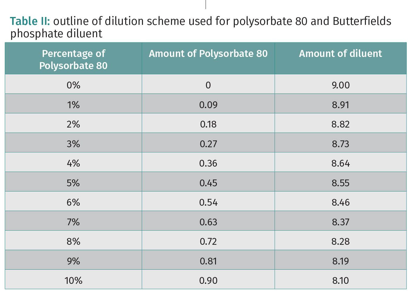 Sample Preparation: Target dilution was created by combining polysorbate 80 and Butterfields phosphate diluent to the desired percentage as described in Table II. Distillate was added to solution and appropriate test was conducted after.