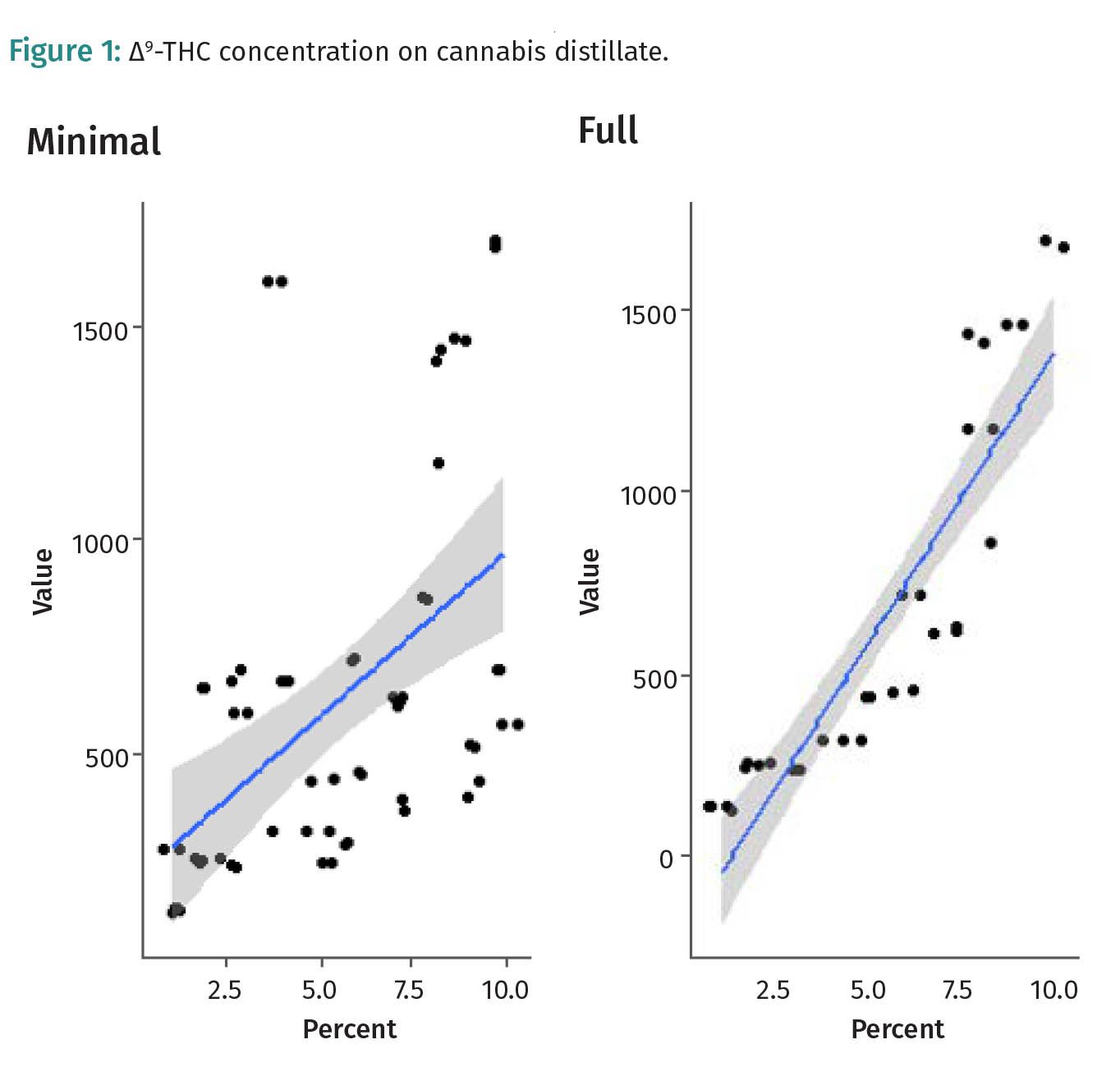 In both the full data and the analysis data with removed values, there were positive correlation between polysorbate 80 percentage and ∆9-tetrahydrocannabinol (THC) recovery.