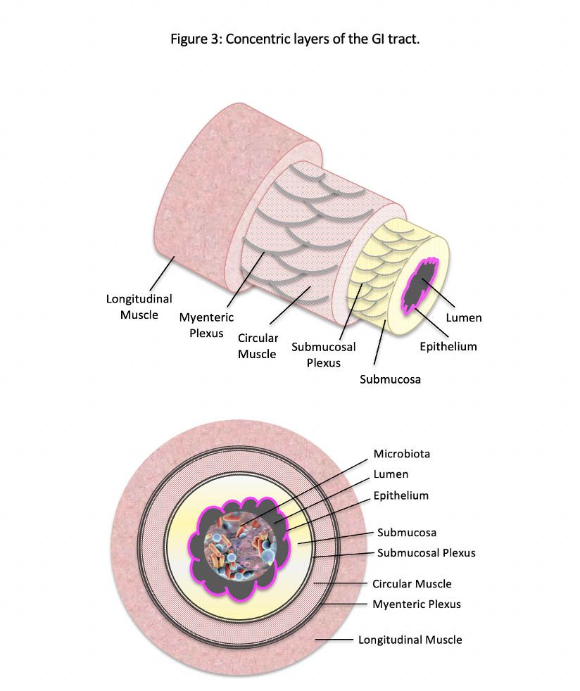 The GI tract is essentially a set of concentric layers or tubes (see Figure 3) that create a path along which food travels as it’s being digested (5).