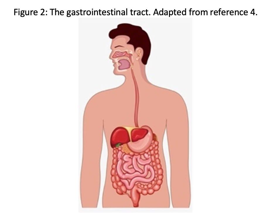 The GI tract (see Figure 2) is a principal component of the GI system (“the gut”) and runs from the esophagus to the rectum. Food enters through the mouth and as it passes along the GI tract, the food is broken down and nutrients are absorbed, and at the end of the tract any waste is eliminated from the body. A healthy GI tract is essential for ensuring the body is amply supplied with the nutrients it needs to fuel all its various activities.