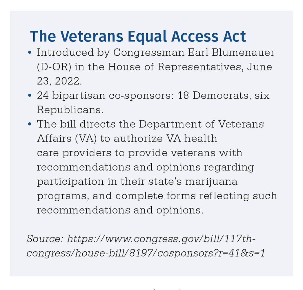 Legitimizing cannabis for veterans has had its true champions in Congress over the years. There have been a handful of bills written and discussed in Congress related to veterans and cannabis for treatment of PTSD and chronic pain: the VA Medicinal Cannabis Research Act of 2018, reintroduced in 2021 (6); the Veterans Medical Marijuana Safe Harbor Act, introduced in April 2021 (7); the VA Medicinal Cannabis Research Act of 2021, introduced April 29, 2021; and the Veterans Equal Access Act, introduced in Congress in March 2017 after a different version of it appeared in 2015 (8). It was subsequently reintroduced in August 2022. Congressman Earl Blumenauer, founder and co-chair of the Congressional Cannabis Caucus, has been a key Congress member actively pushing for discussion and votes on these veteran's bills all along.