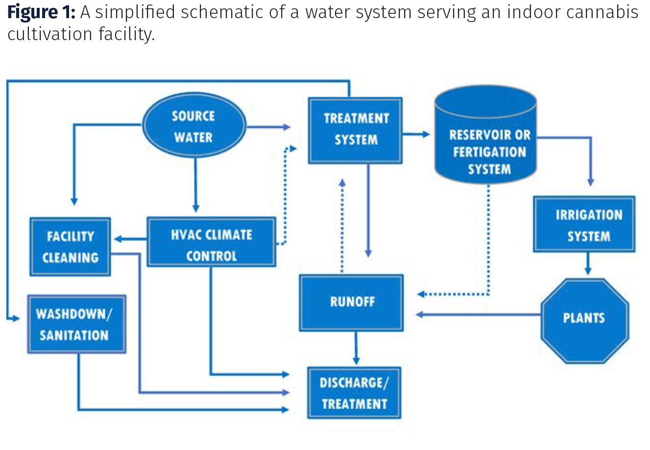 Water is a critical resource for cannabis cultivation operations no matter the cultivation method; whether grown outdoors, in a greenhouse, or in a warehouse, cannabis requires water throughout all stages of plant growth for various applications. Some of these uses include irrigation for cultivation, water for heating and cooling processes such as hydronic heating systems and wet wall cooling systems (1), fogging for humidification processes, fogging for application of pest management solutions, and water used for cleaning activities.