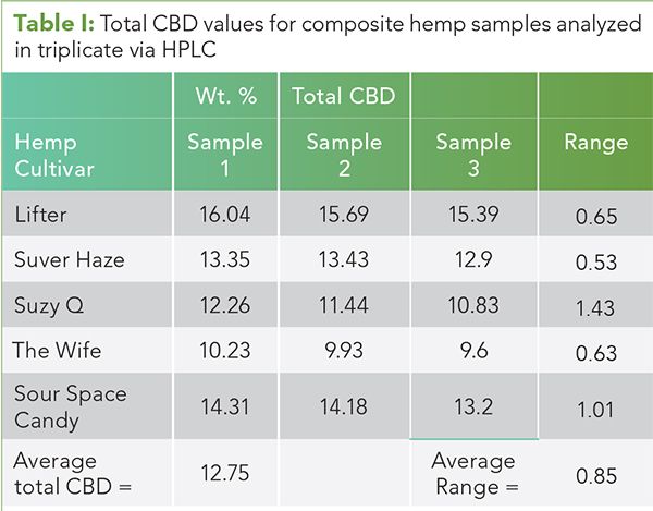 Another problem with the composite sample approach is that it is assumed that the composite sample is uniform. I have seen no data to support this. My own work on this subject is seen in Table I. Five ground, homogenized composite hemp samples representing different strains were analyzed in triplicate via HPLC at a state licensed, ISO certified third party testing laboratory, SC Labs in Santa Cruz, CA (15). The total CBD values obtained on these samples are listed in the table.