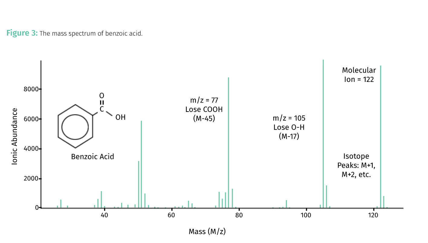 Note that benzoic acid contains a mono-substituted benzene ring and a carboxylic acid or -COOH group. The y-axis of the spectrum in Figure 3 is ionic abundance, a count of the number of ions detected at each m/z.