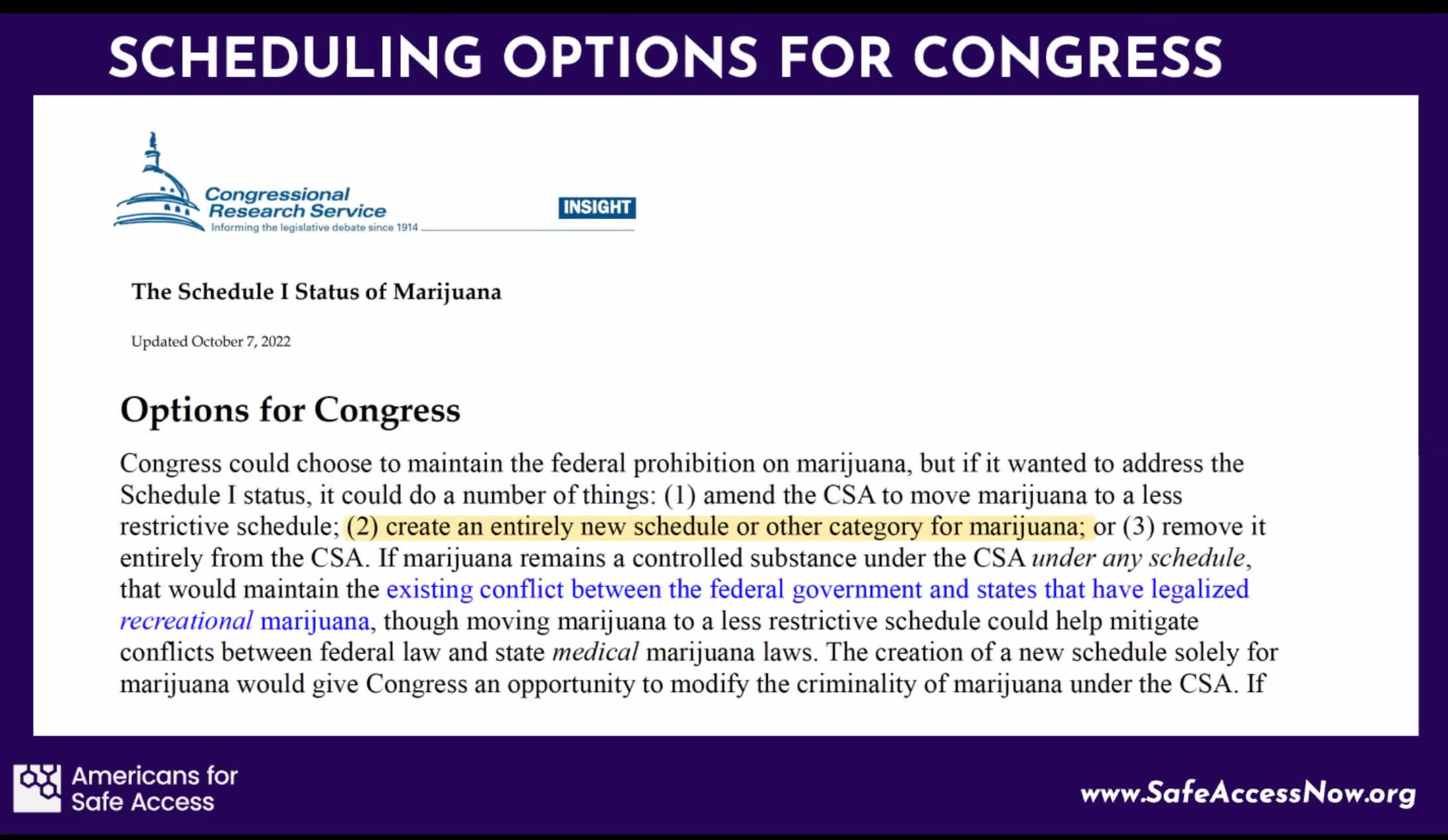 A slide from Americans for Safe Access' webinar explaining scheduling options for Congress.
