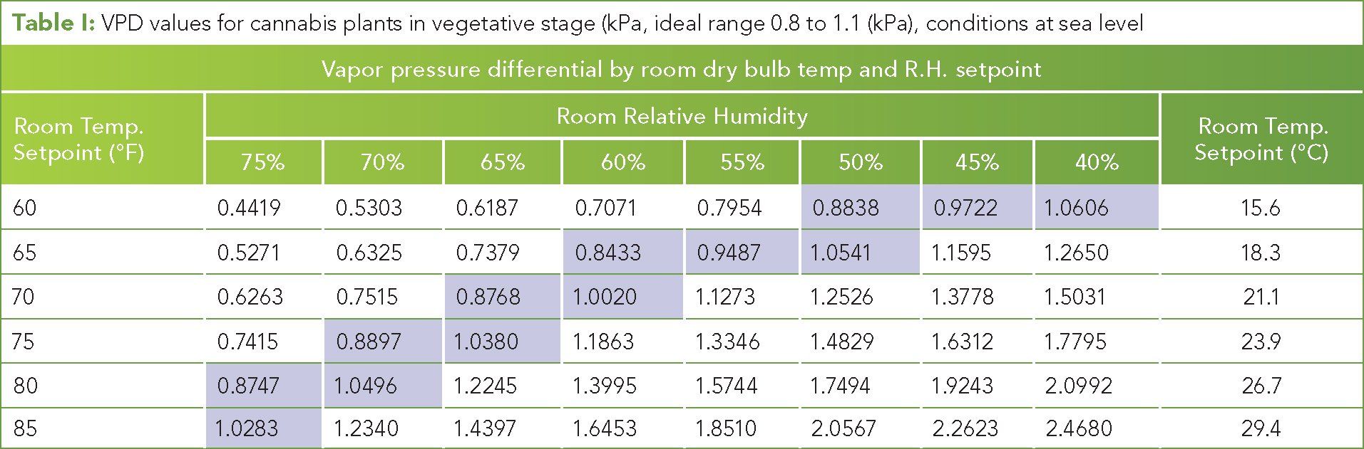 Table I: Vapor pressure differential by room dry bulb temperature and RH setpoint. Purple boxes indicate that the VPD is in the ideal range of 0.8 to 1.1 (pKa) for the vegetative state. Other boxes are outside the ideal range for the vegetative state.